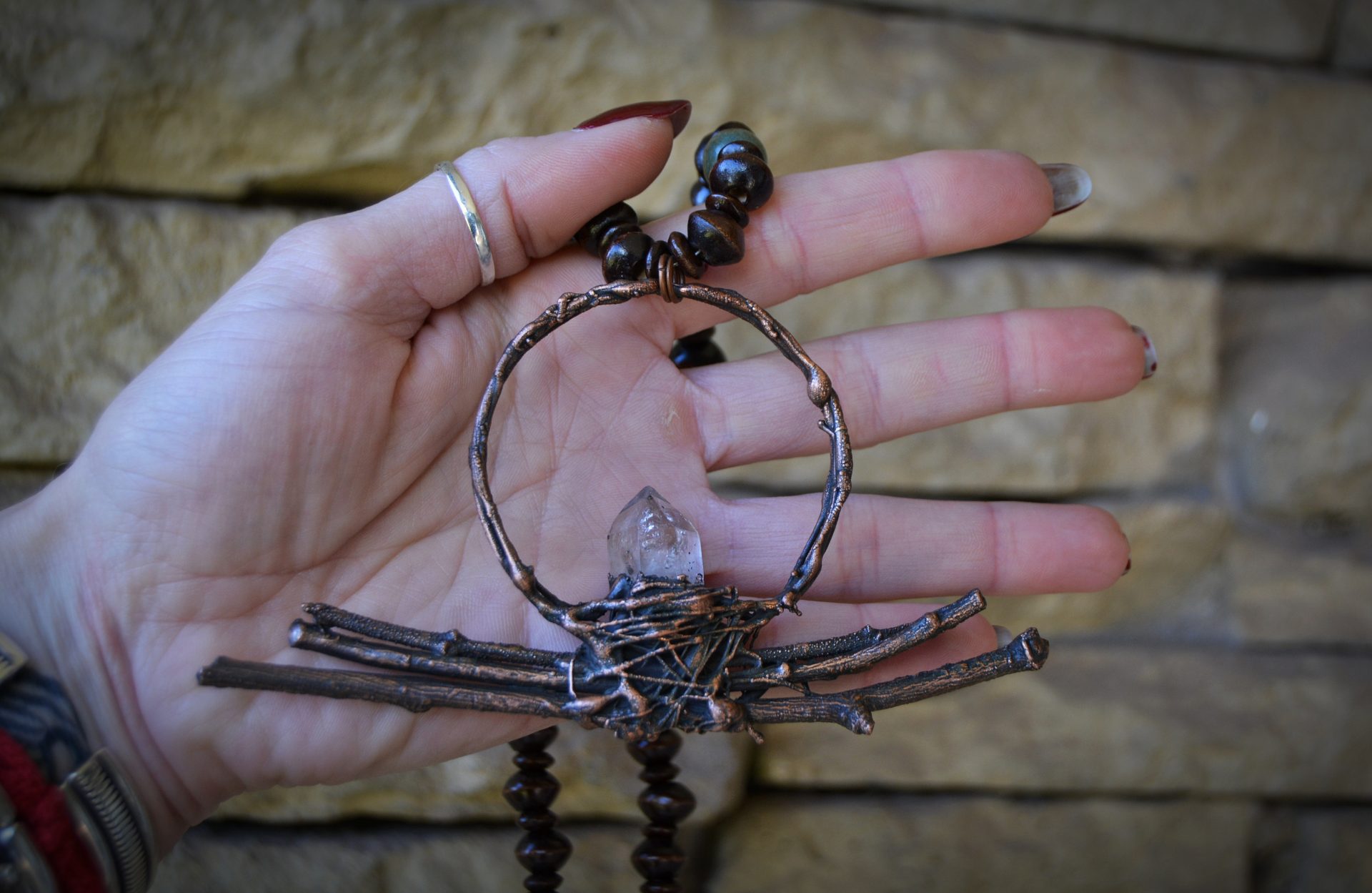 A unique, hand crafted copper, forest twig pendant with a raw Quartz point.