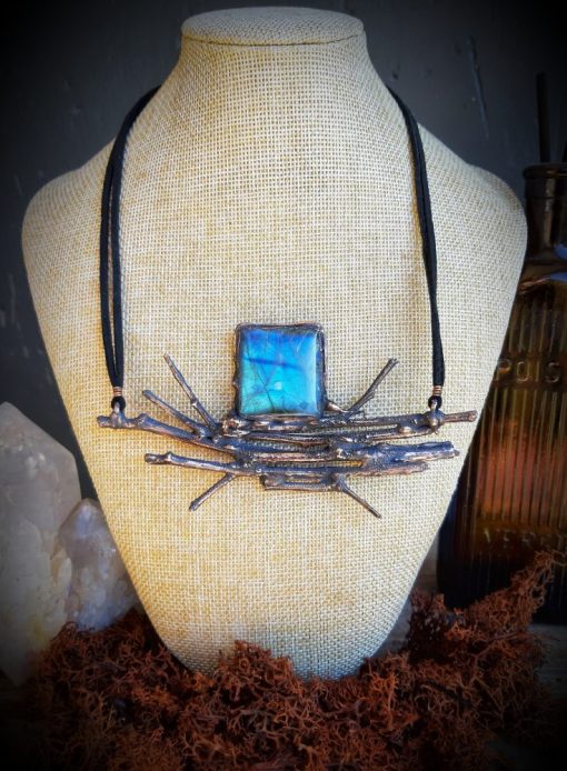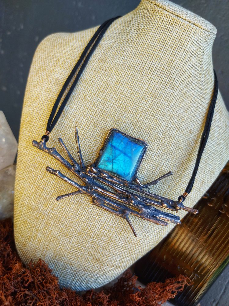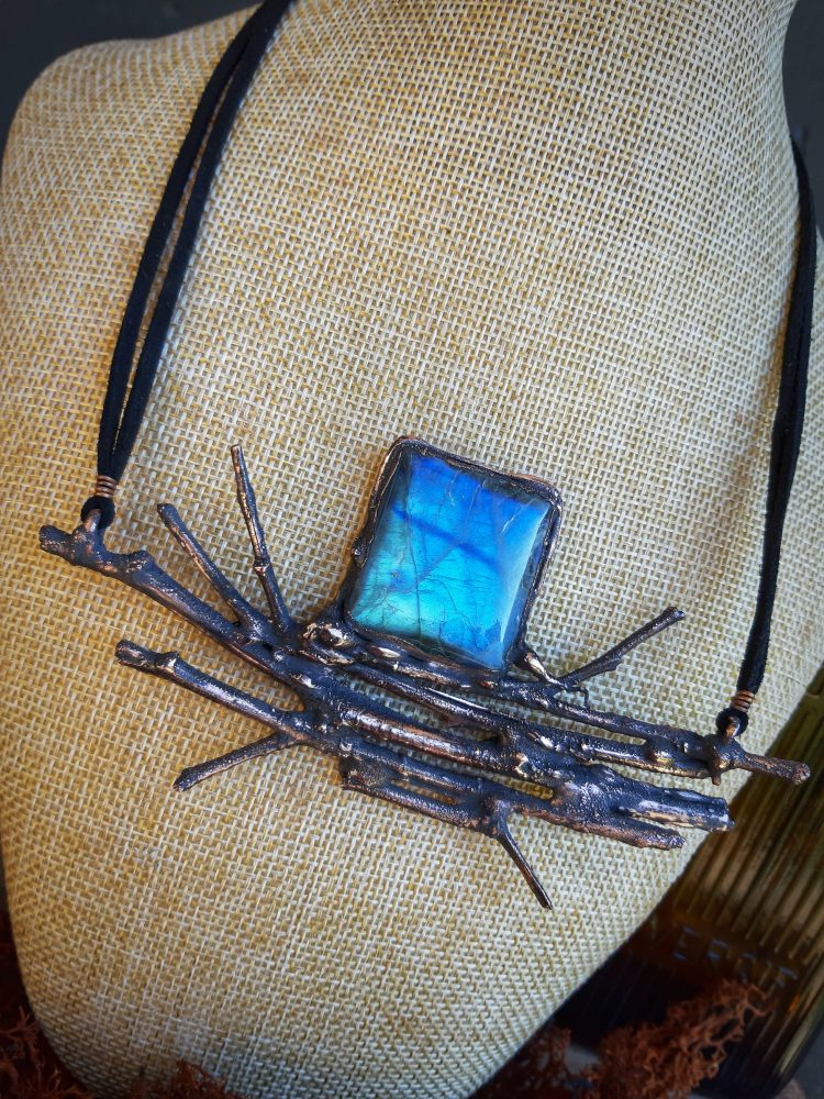 A unique, hand crafted, large twig style pendant with a polished Labradorite stone, set in copper, strung on a black faux leather necklace.