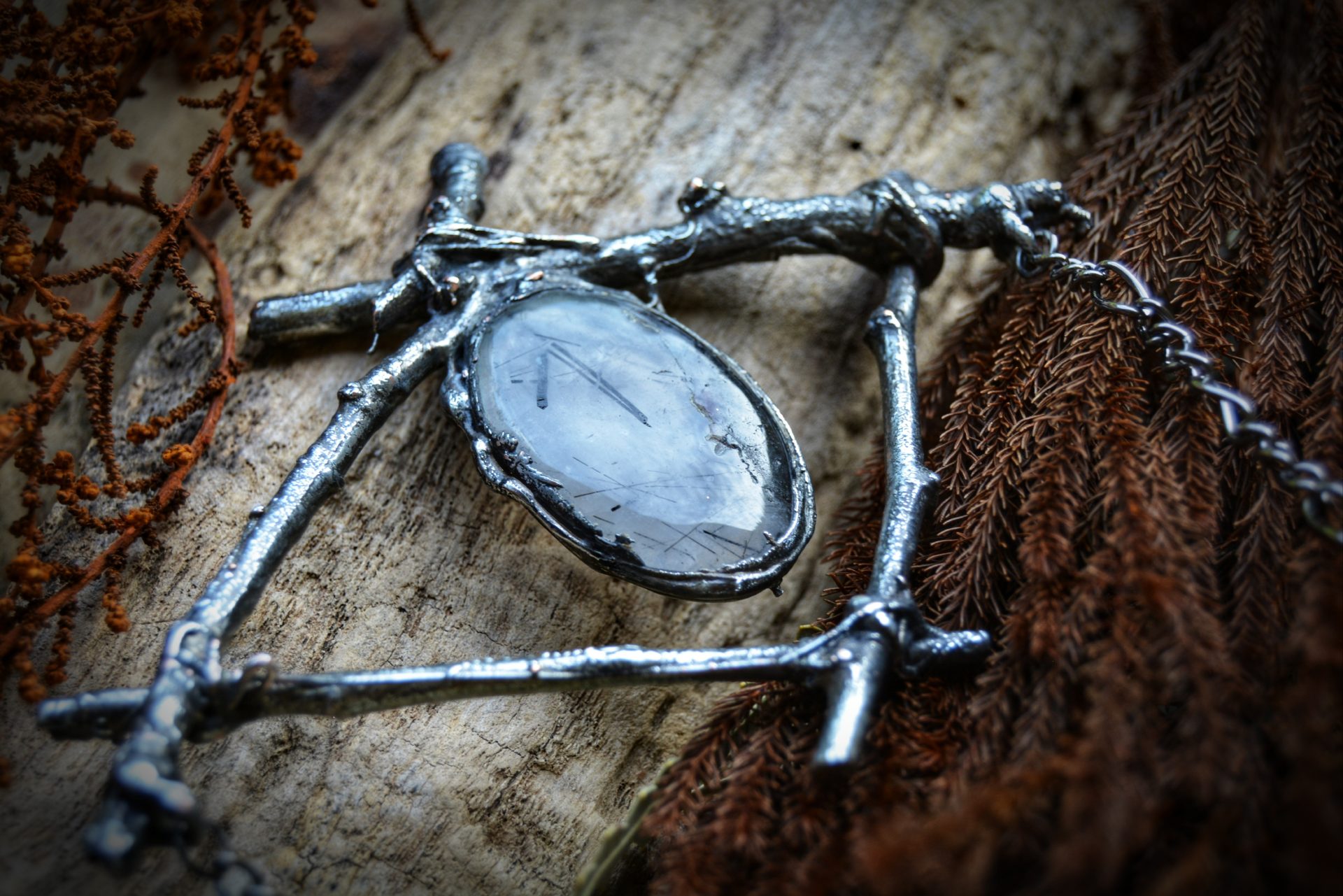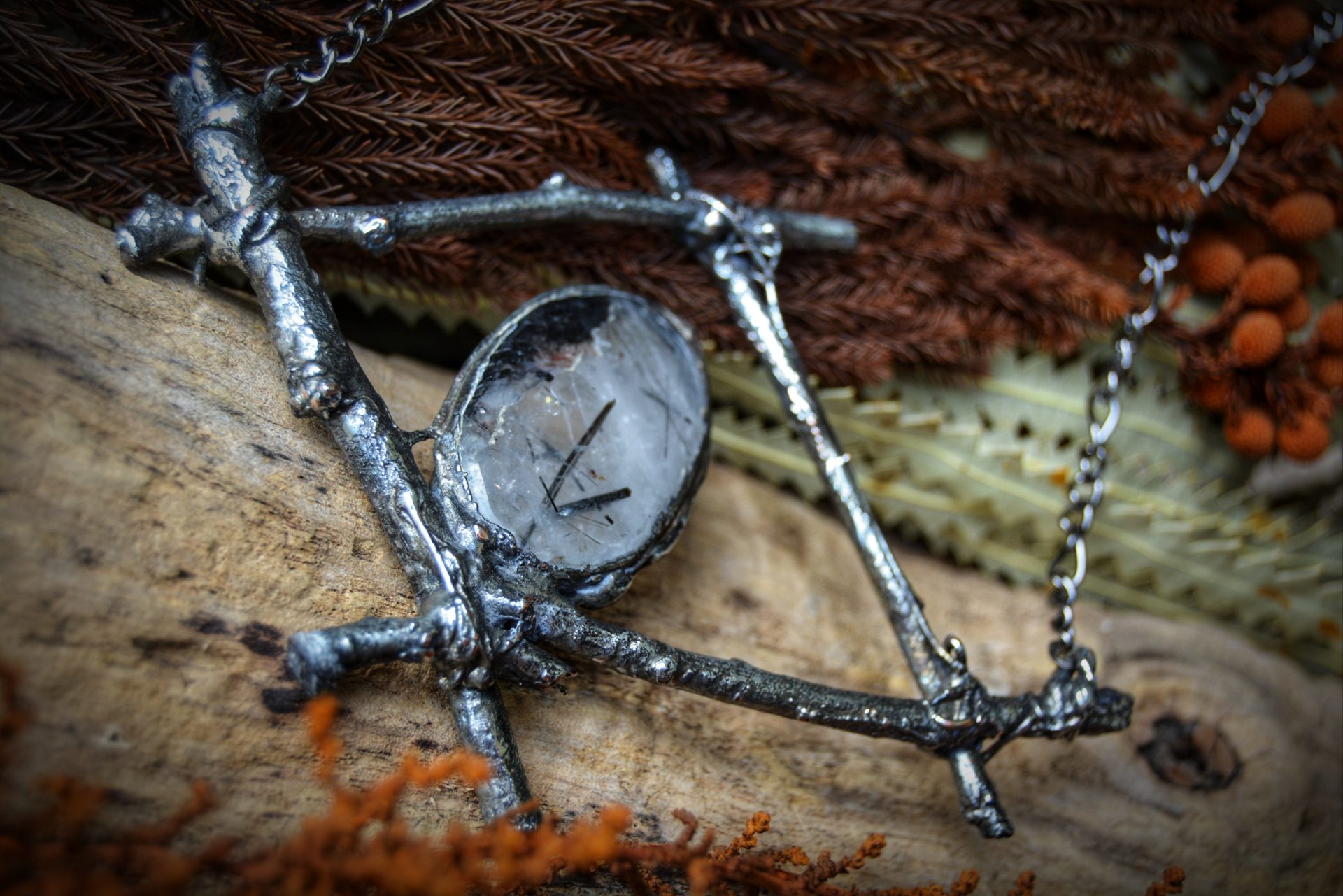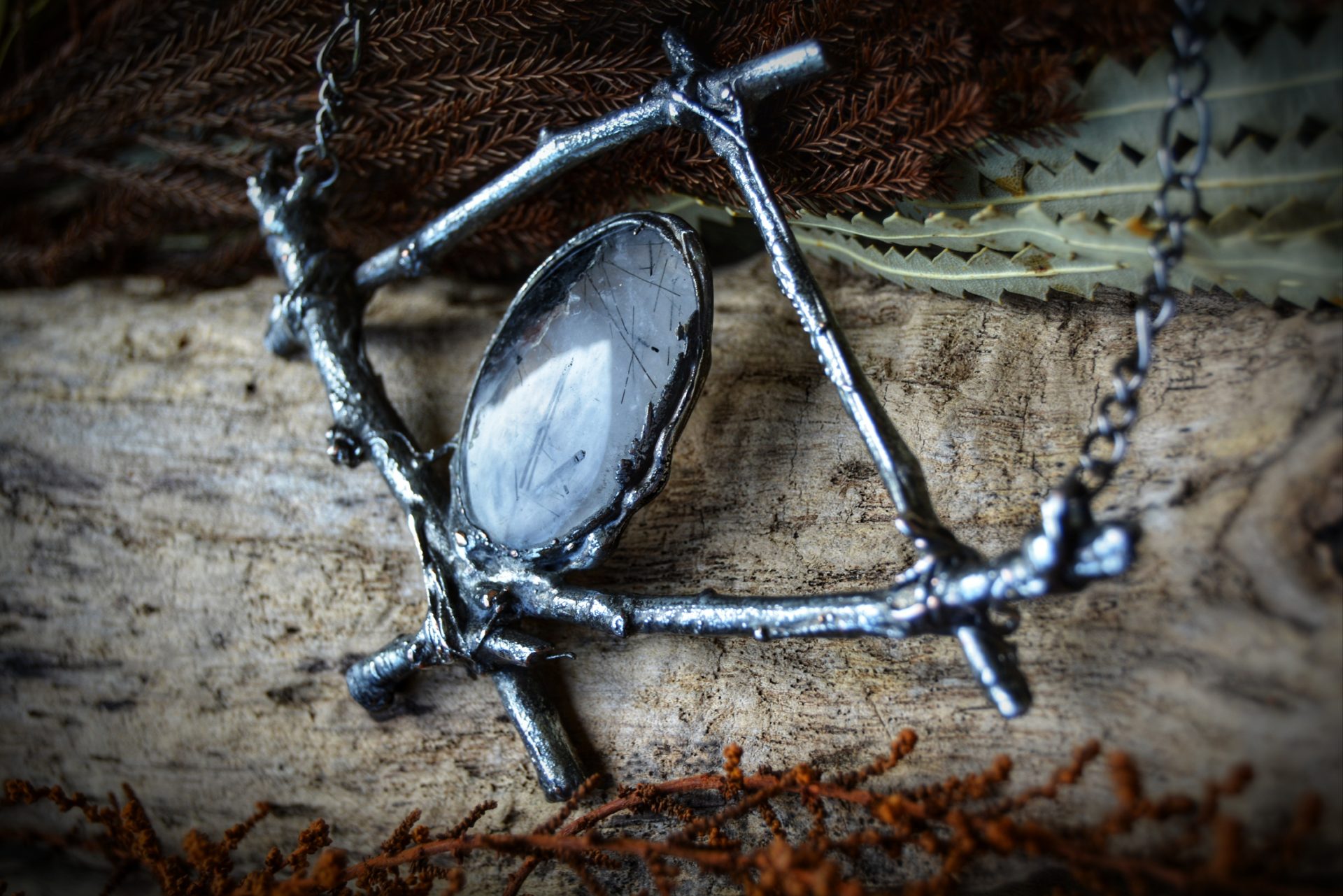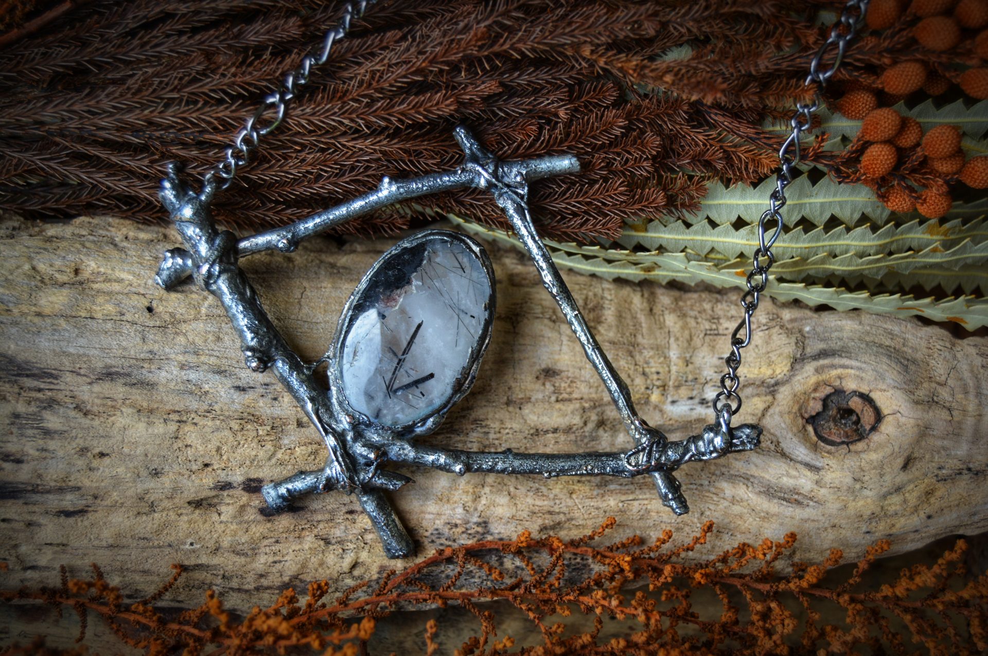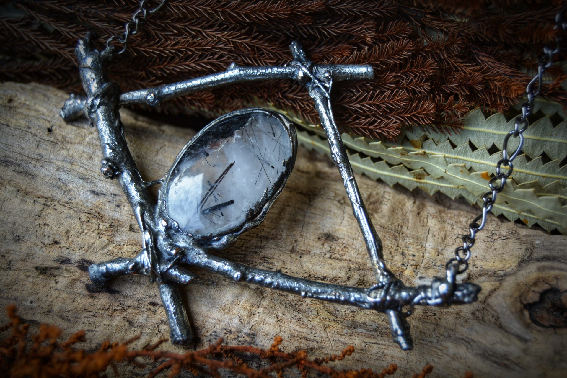 A unique, hand crafted copper, silver metal forest twig pendant with a Tourmalinated Quartz cabochon, strung a gunmetal chain necklace.