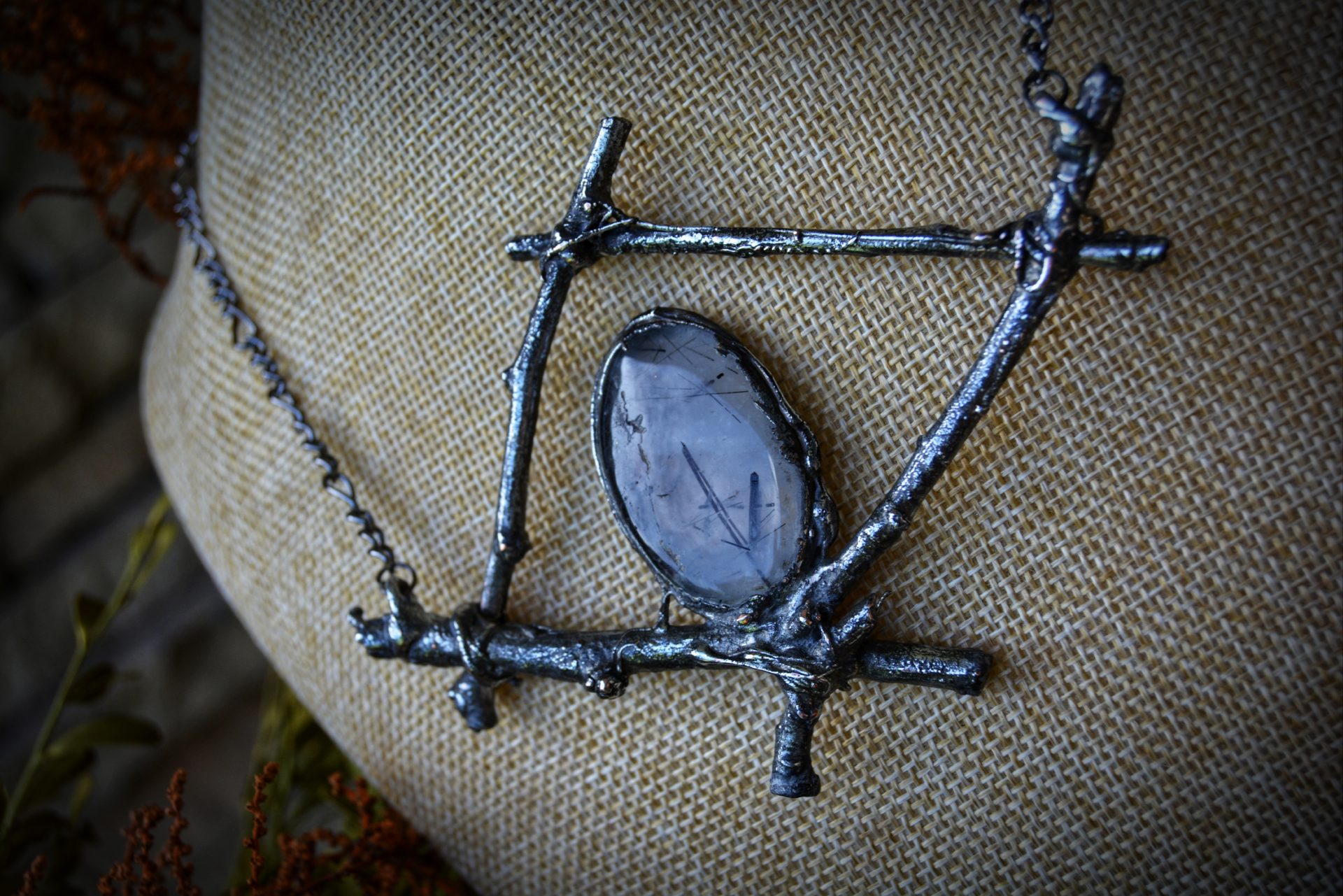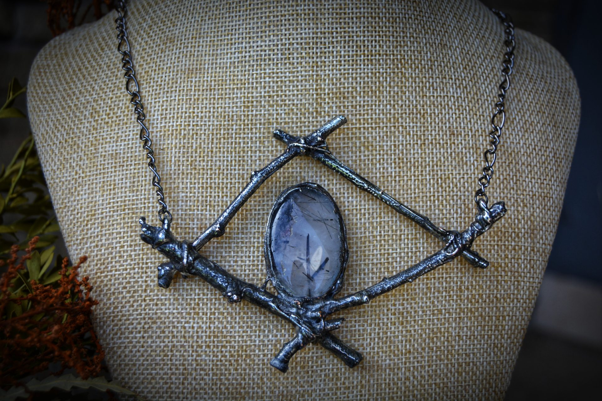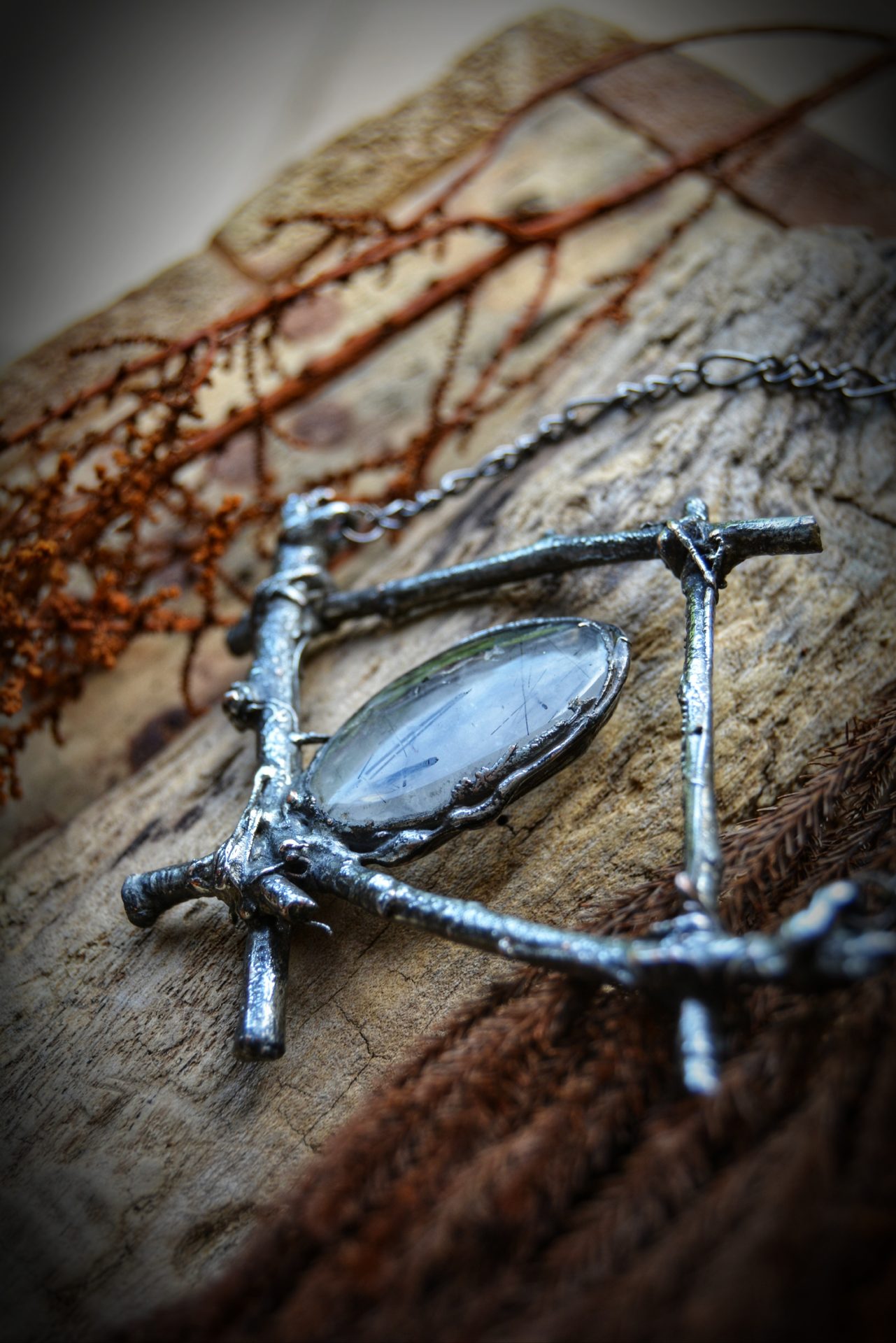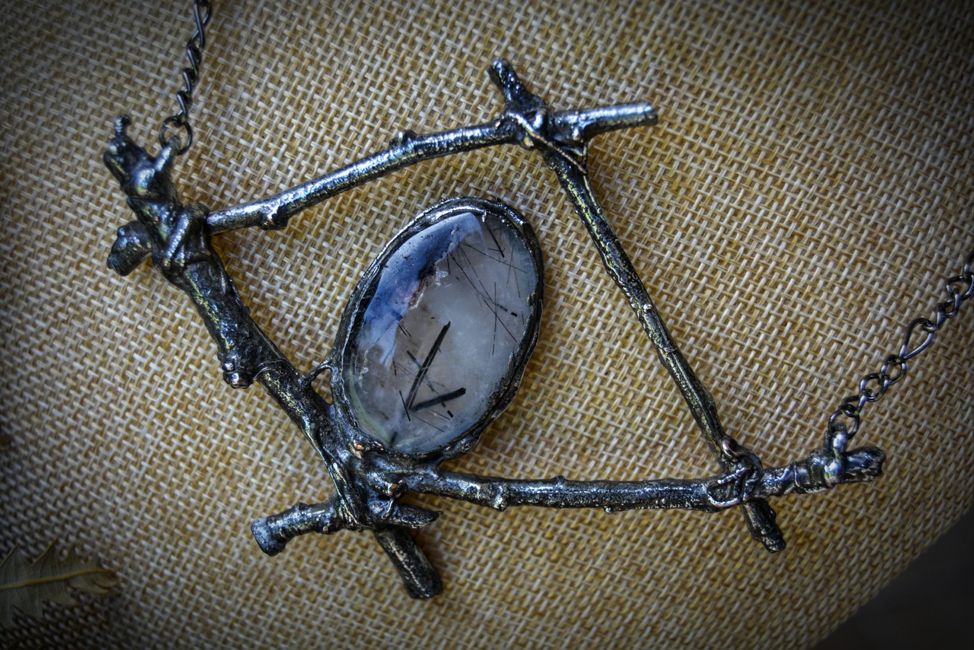 A unique, hand crafted copper, silver metal forest twig pendant with a Tourmalinated Quartz cabochon, strung a gunmetal chain necklace.