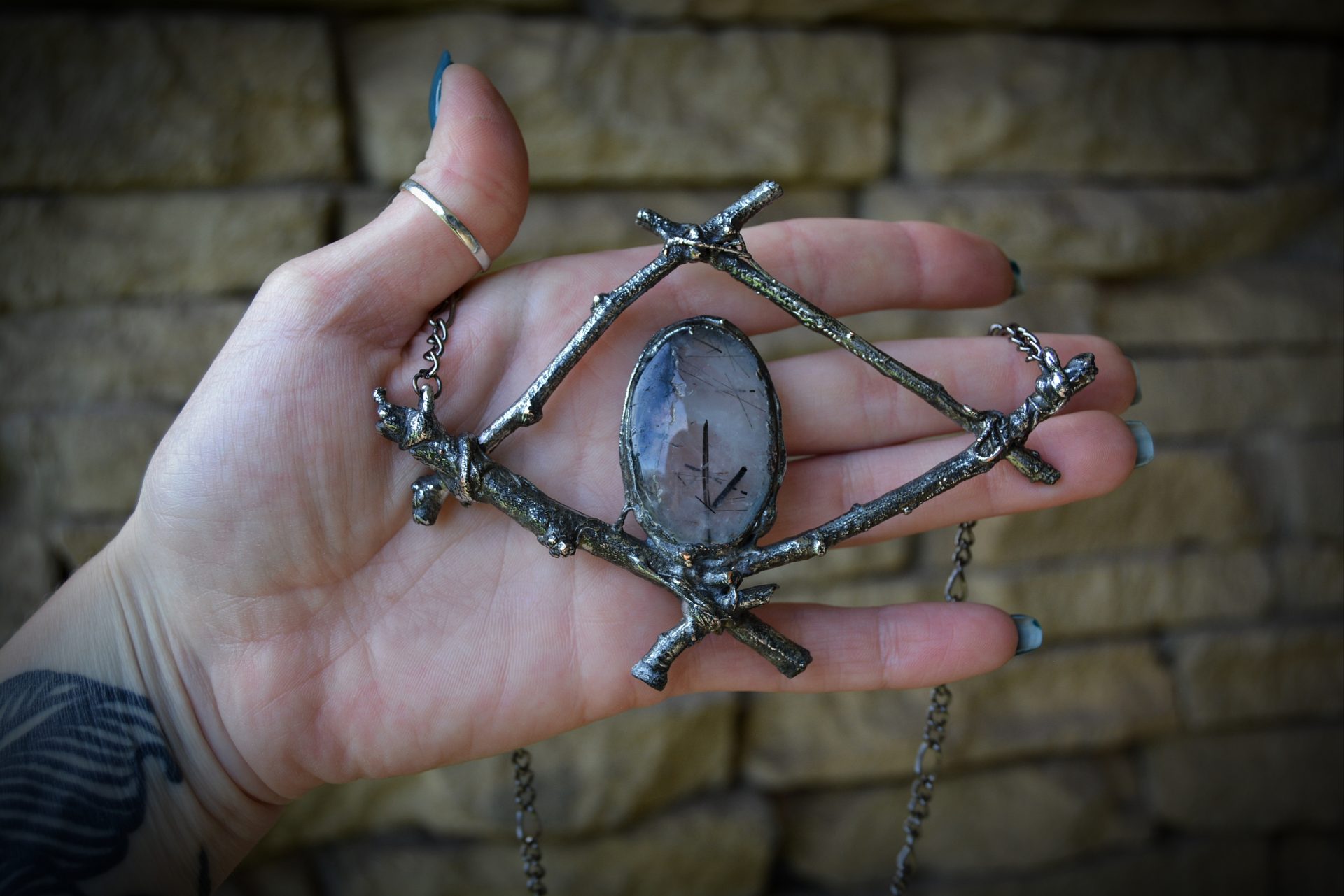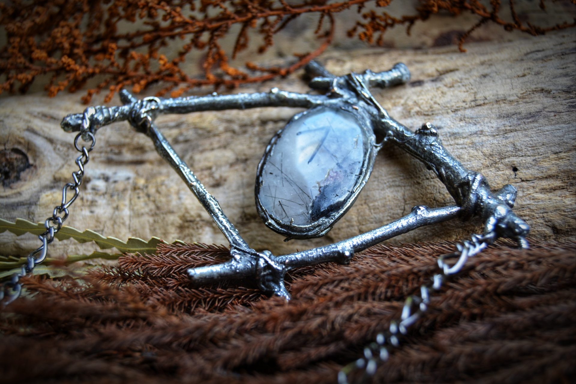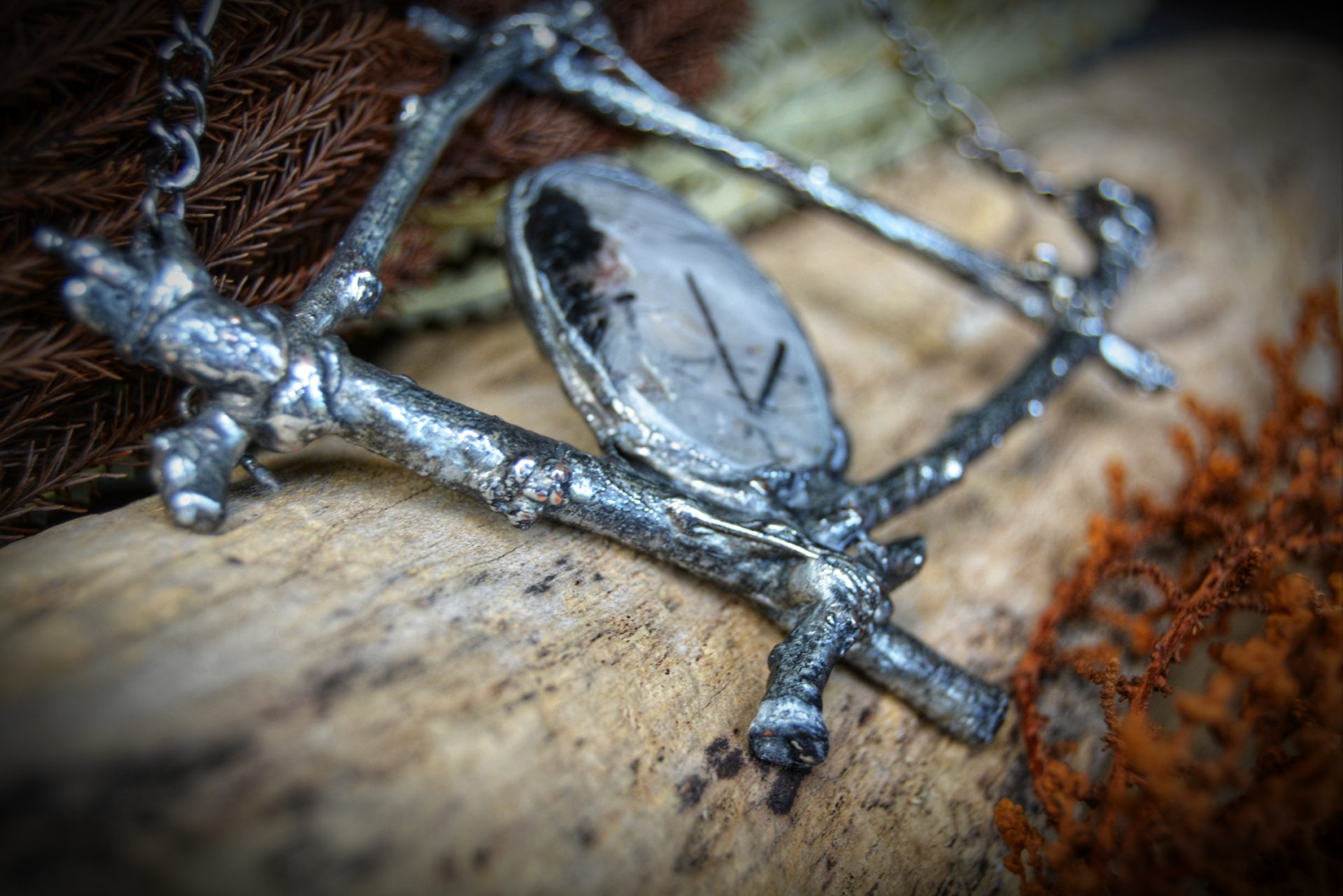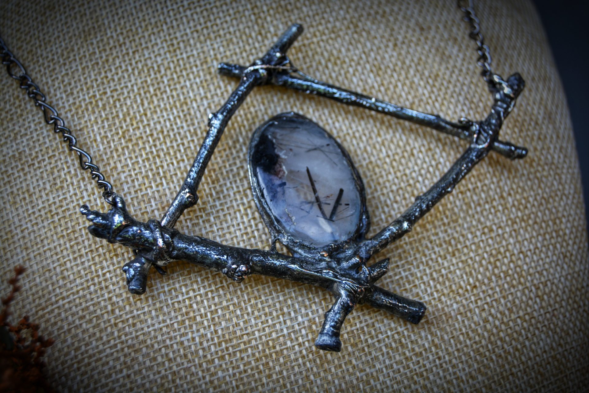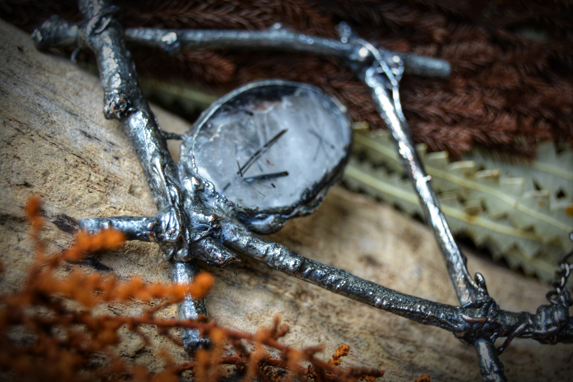 A unique, hand crafted copper, silver metal forest twig pendant with a Tourmalinated Quartz cabochon, strung a gunmetal chain necklace.