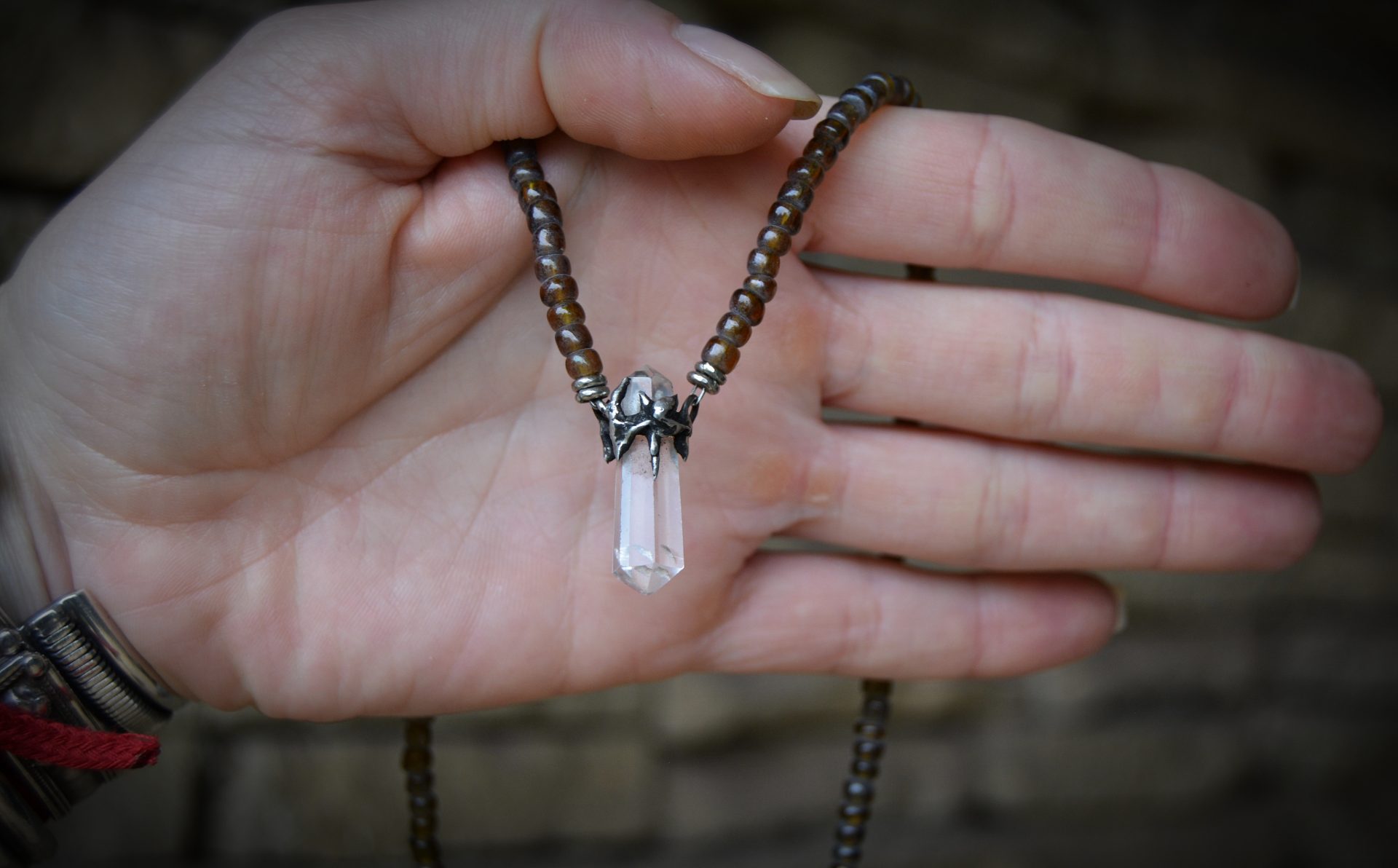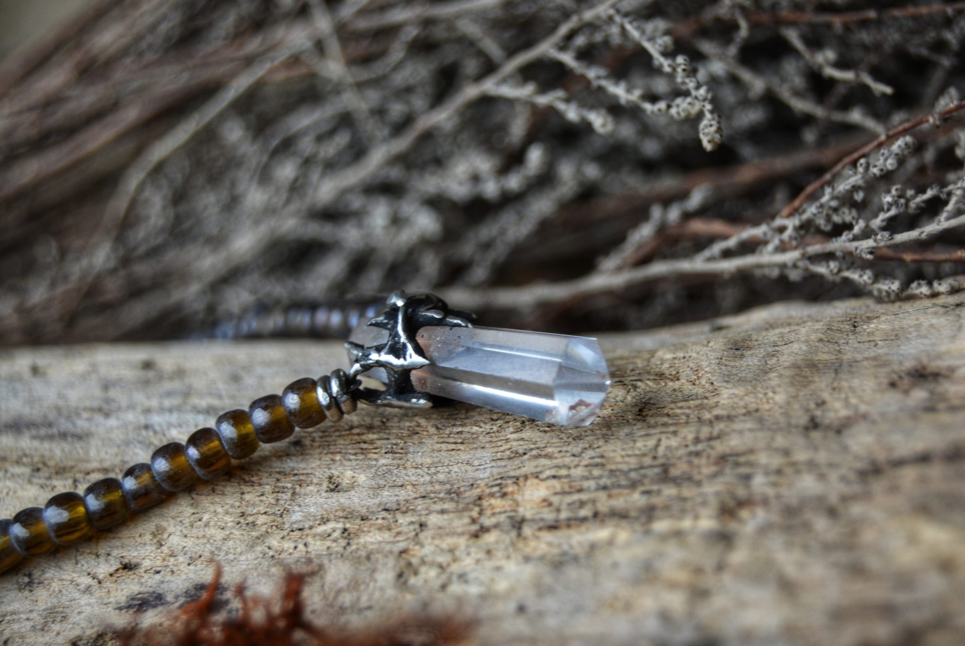 A unique, hand crafted silver metal pendant with a polished double terminated Quartz point.