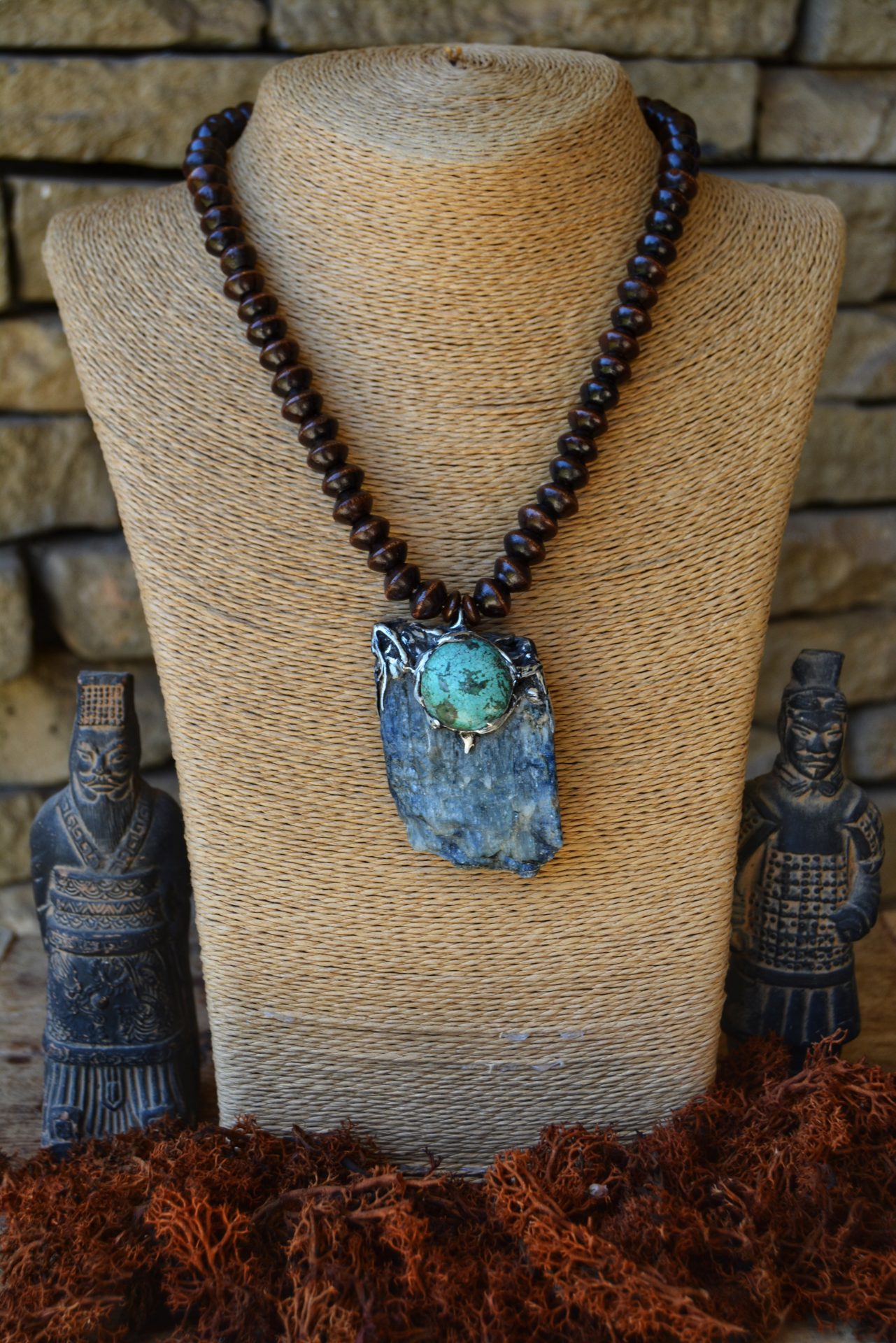 Strung on a brown wooden beaded necklace.