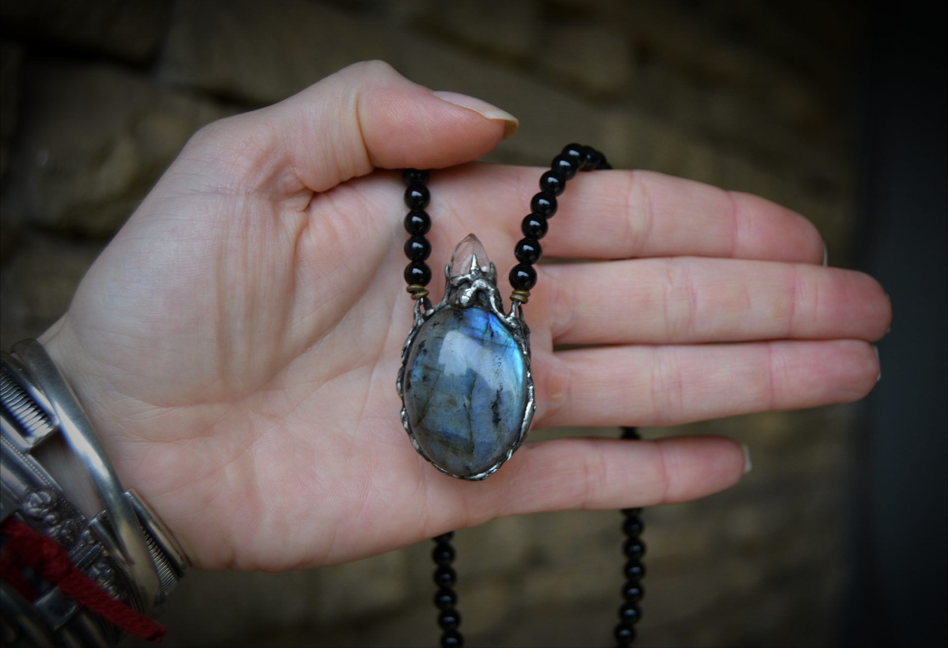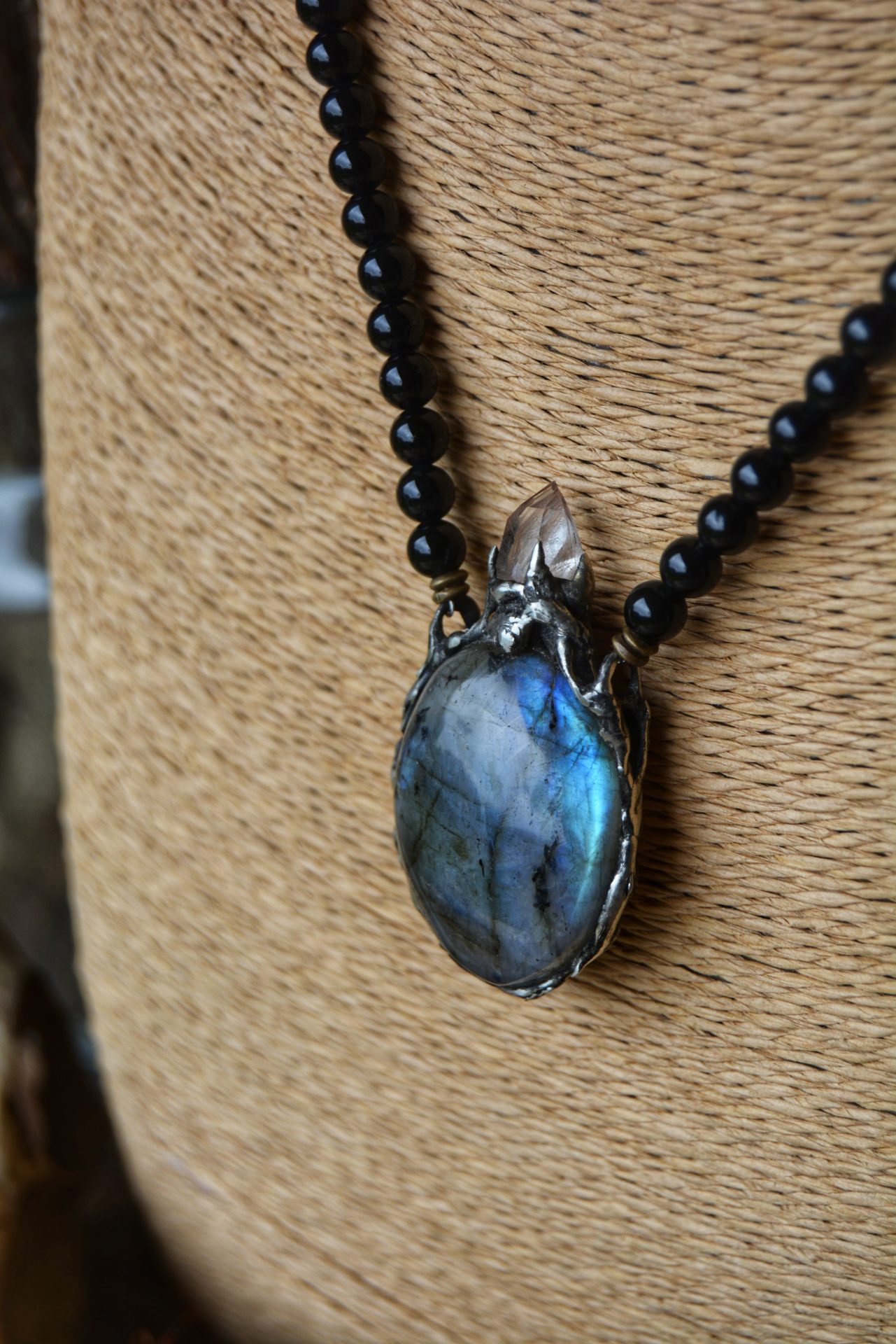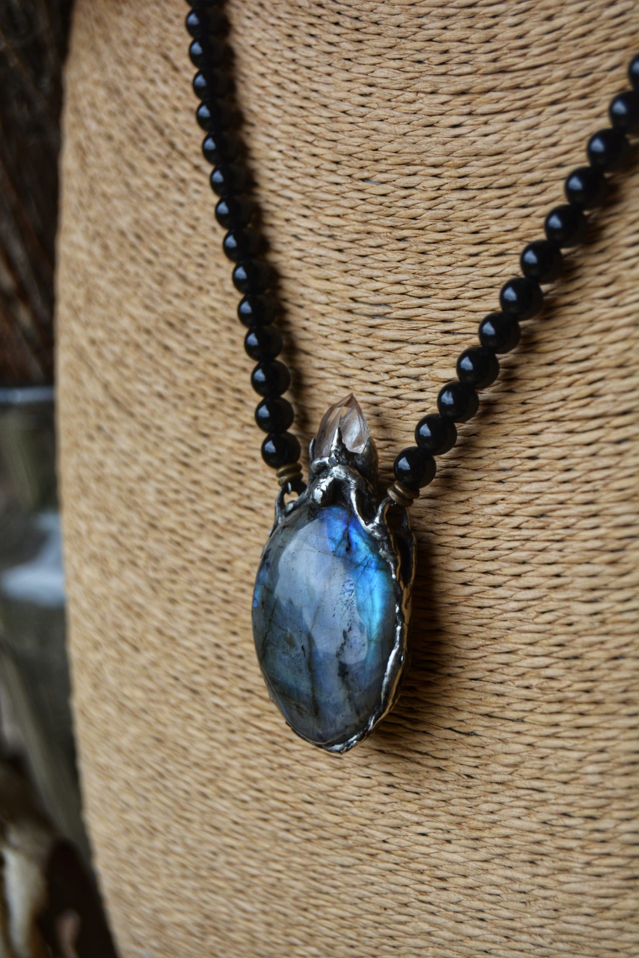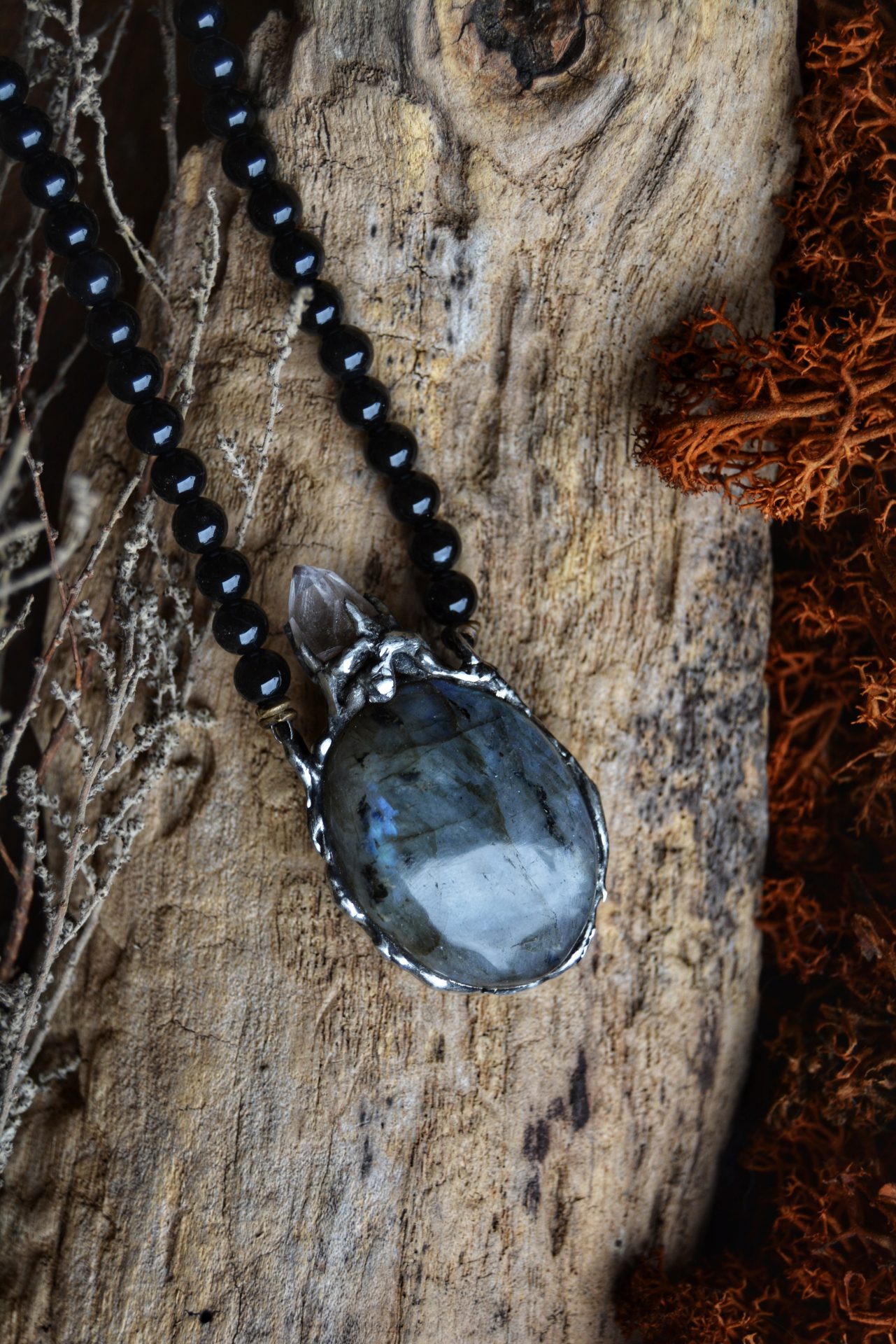 A unique, hand crafted silver metal pendant with a polished Labradorite & Quartz point.
