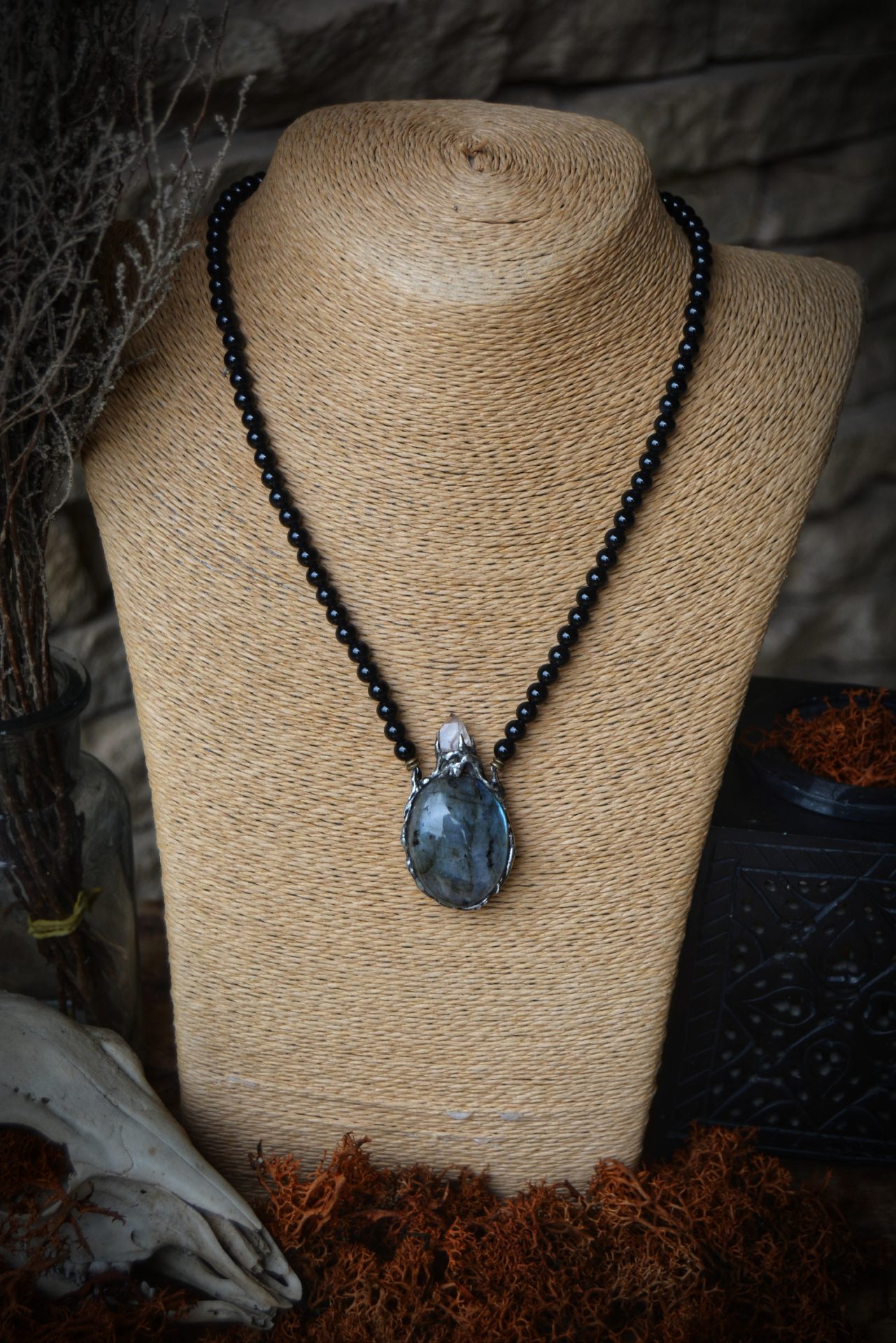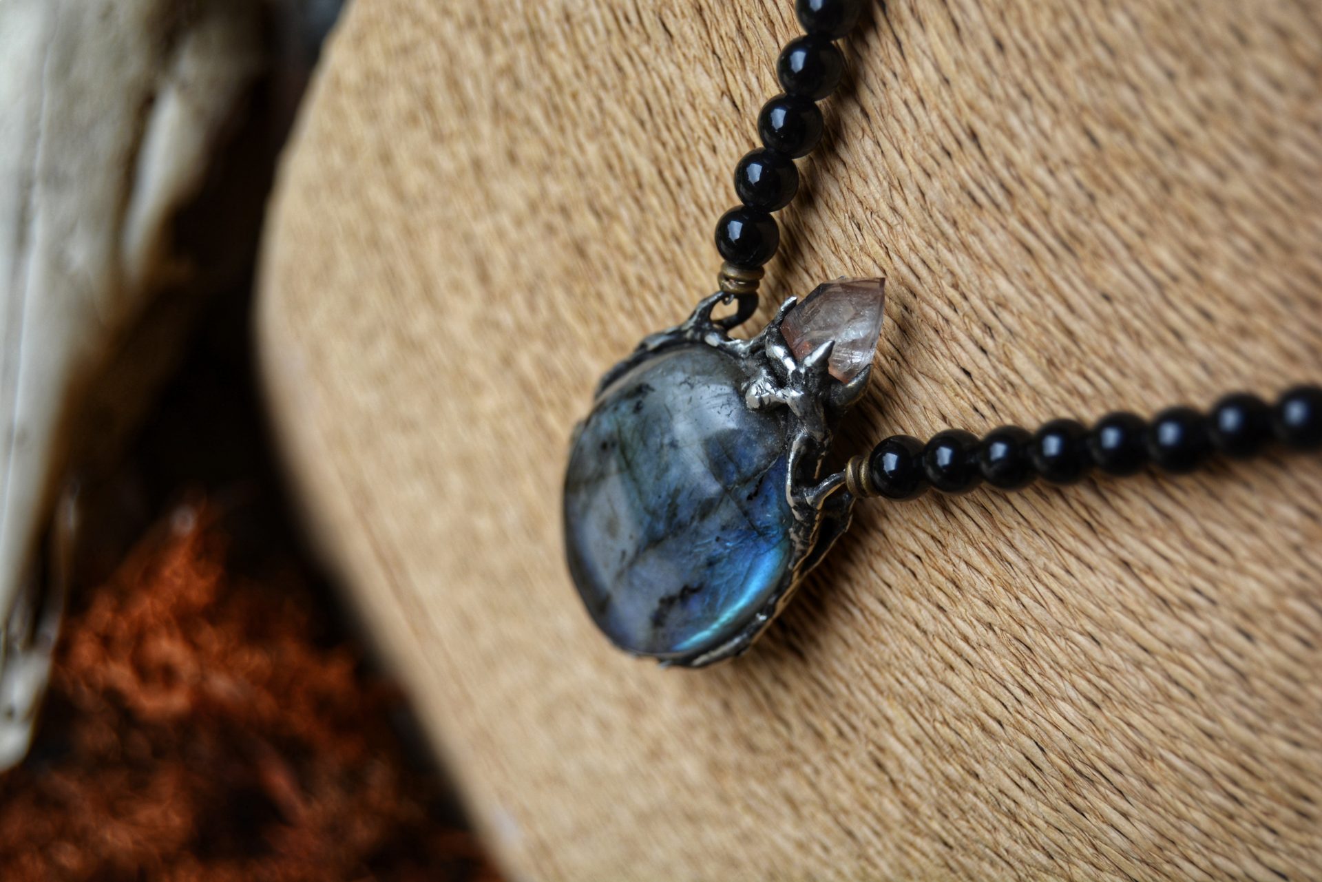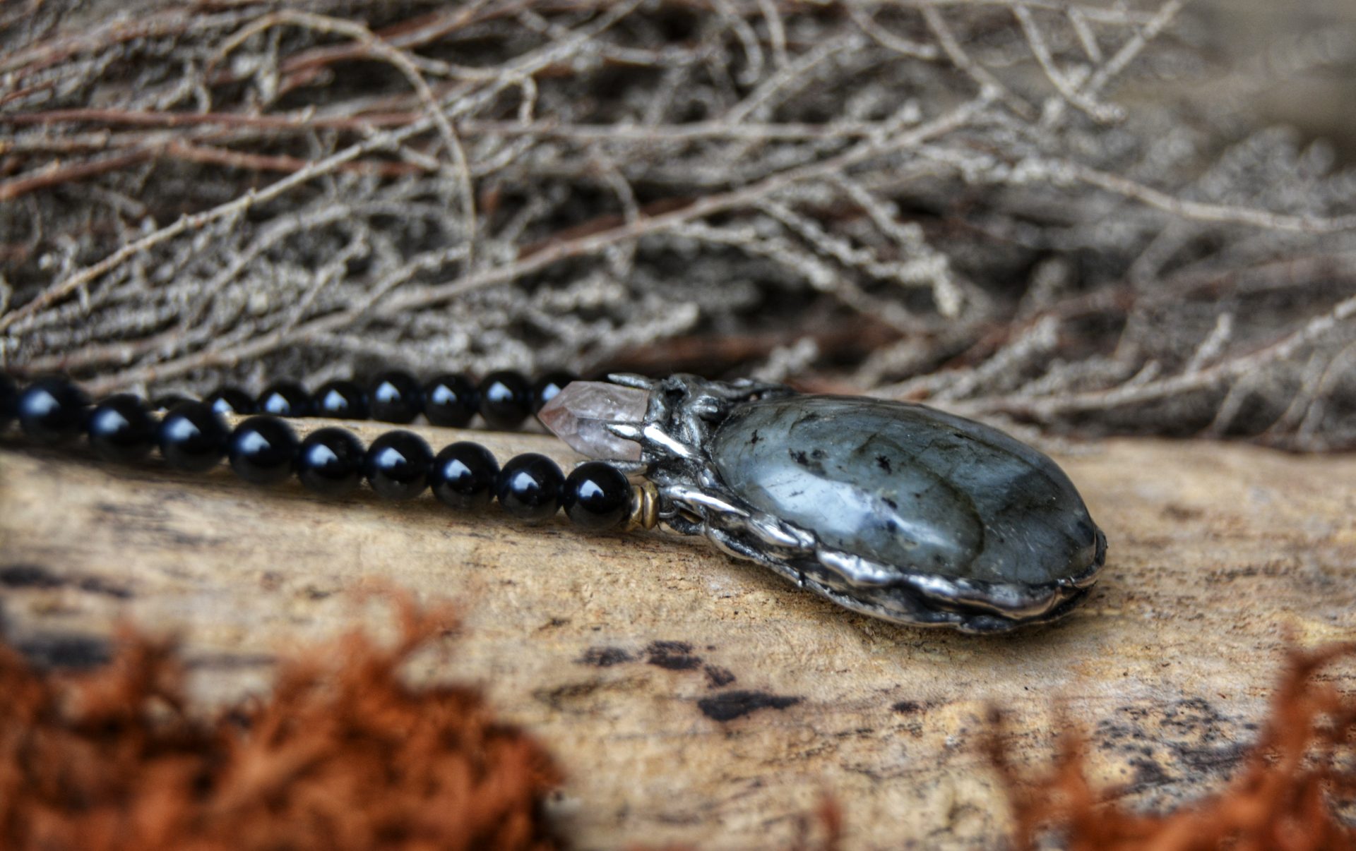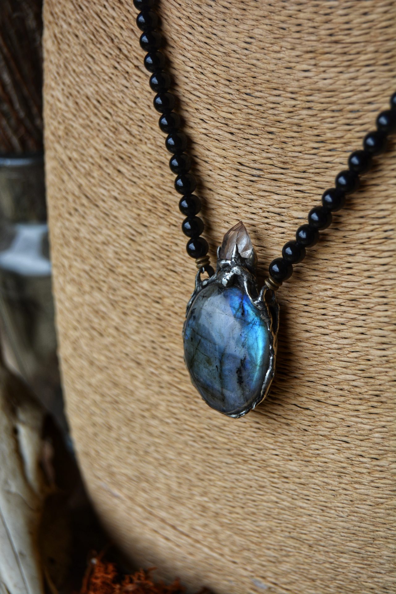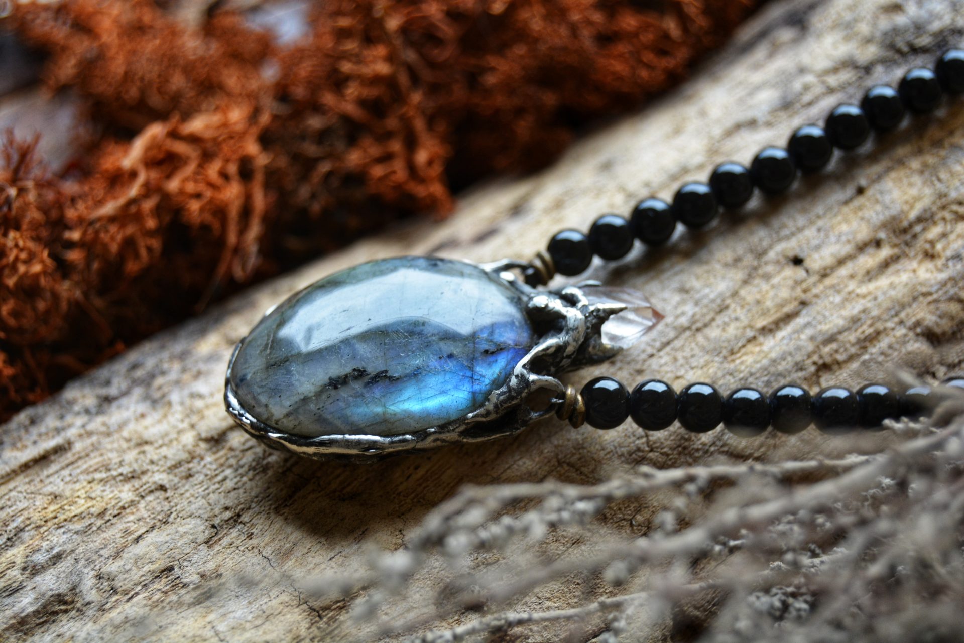 A unique, hand crafted silver metal pendant with a polished Labradorite & Quartz point.